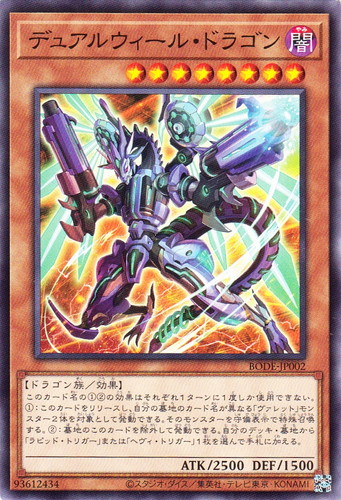 ![]() ![]() | BODE-JP002 デュアルウィール・ドラゴン モンスター BURST OF DESTINY ノーマル 属性:闇 分類:効果 種族:ドラゴン族 レベル:8 攻撃力:2500 守備力:1500 このカード名の①②の効果はそれぞれ1ターンに1度しか使用できない。 ①:このカードをリリースし、自分の墓地のカード名が異なる「ヴァレット」モンスター2体を対象として発動できる。そのモンスターを守備表示で特殊召喚する。 ②:墓地のこのカードを除外して発動できる。自分のデッキ・墓地から「ラビット・トリガー」または「ヘヴィ・トリガー」1枚を選んで手札に加える。 |