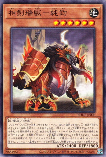 ![]() ![]() | BODE-JP006 相剣瑞獣―純鈞 モンスター BURST OF DESTINY ノーマル 属性:地 分類:効果 種族:幻竜族 レベル:6 攻撃力:2400 守備力:1800 このカード名の①③の効果はそれぞれ1ターンに1度しか使用できない。 ①:自分・相手のメインフェイズに、自分フィールドのモンスター1体をリリースして発動できる。このカードを手札から特殊召喚する。 ②:自分の幻竜族モンスターが、EXデッキから特殊召喚された相手モンスターと戦闘を行うダメージ計算前に発動できる。その相手モンスターとこのカードを破壊する。 ③:このカードがS素材として墓地に送られた場合、自分または相手の、フィールド・墓地のカード1枚を対象として発動できる。そのカードを除外する。 |