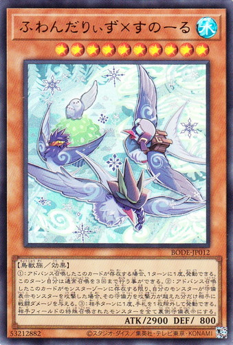 ![]() ![]() | BODE-JP012 ふわんだりぃず×すのーる モンスター BURST OF DESTINY ウルトラレア 属性:水 分類:効果 種族:鳥獣族 レベル:10 攻撃力:2900 守備力:800 ①:アドバンス召喚したこのカードが存在する場合、1ターンに1度、発動できる。このターン自分は通常召喚を3回まで行う事ができる。 ②:アドバンス召喚したこのカードがモンスターゾーンに存在する限り、自分のモンスターが守備表示モンスターを攻撃した場合、その守備力を攻撃力が超えた分だけ相手に戦闘ダメージを与える。 ③:相手ターンに1度、手札を1枚除外して発動できる。相手フィールドの特殊召喚されたモンスターを全て裏側守備表示にする。 |