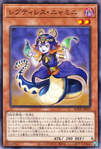 ![]() ![]() | BODE-JP019 レプティレス・ニャミニ モンスター BURST OF DESTINY ノーマル 属性:闇 分類:効果 種族:爬虫類族 レベル:2 攻撃力:200 守備力:0 このカード名の①②の効果は1ターンに1度、いずれか1つしか使用できない。 ①:自分の墓地に爬虫類族モンスターが存在する場合、自分・相手のメインフェイズに、このカードを手札から墓地へ送り、相手フィールドの表側表示モンスター1体を対象として発動できる。そのモンスターの攻撃力を0にする。 ②:相手フィールドに攻撃力0のモンスターが存在する場合に発動できる。このカードを墓地から特殊召喚する。 |