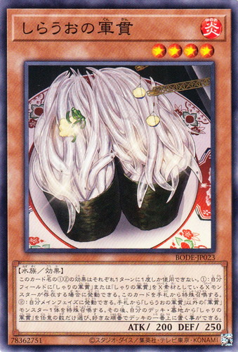![]() ![]() | BODE-JP023 しらうおの軍貫 モンスター BURST OF DESTINY ノーマル 属性:炎 分類:効果 種族:水族 レベル:4 攻撃力:200 守備力:250 このカード名の①②の効果はそれぞれ1ターンに1度しか使用できない。 ①:自分フィールドに「しゃりの軍貫」または「しゃりの軍貫」をX素材としているXモンスターが存在する場合に発動できる。このカードを手札から特殊召喚する。 ②:自分メインフェイズに発動できる。手札から「しらうおの軍貫」以外の「軍貫」モンスター1体を特殊召喚する。その後、自分のデッキ・墓地から「しゃりの軍貫」を任意の数だけ選び、好きな順番でデッキの一番上に置く事ができる。 |