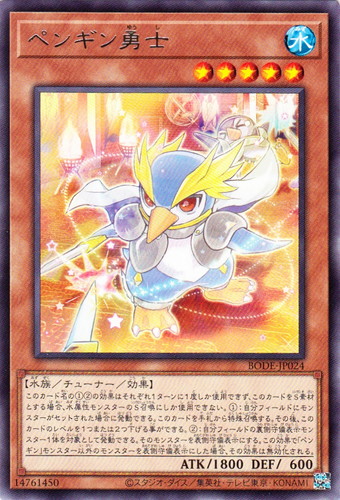 ![]() ![]() | BODE-JP024 ペンギン勇士 モンスター BURST OF DESTINY レア 属性:水 分類:チューナー/効果 種族:水族 レベル:5 攻撃力:1800 守備力:600 このカード名の①②の効果はそれぞれ1ターンに1度しか使用できず、このカードをS素材とする場合、水属性モンスターのS召喚にしか使用できない。 ①:自分フィールドにモンスターがセットされた場合に発動できる。このカードを手札から特殊召喚する。その後、このカードのレベルを1つまたは2つ下げる事ができる。 ②:自分フィールドの裏側守備表示モンスター1体を対象として発動できる。そのモンスターを表側守備表示にする。この効果で「ペンギン」モンスター以外のモンスターを表側守備表示にした場合、その効果は無効化される。 |