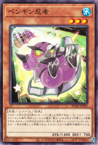 ![]() ![]() | BODE-JP025 ペンギン忍者 モンスター BURST OF DESTINY ノーマル 属性:水 分類:リバース/効果 種族:水族 レベル:3 攻撃力:1400 守備力:700 このカード名の②の効果は1ターンに1度しか使用できない。 ①:このカードがリバースした場合、相手フィールドの魔法・罠カードを2枚まで対象として発動できる。そのカードを持ち主の手札に戻す。 ②:自分フィールドの「ペンギン」モンスター1体を対象として発動できる。そのモンスターを裏側守備表示にする。 |