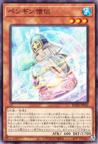 ![]() ![]() | BODE-JP026 ペンギン僧侶 モンスター BURST OF DESTINY ノーマル 属性:水 分類:効果 種族:水族 レベル:3 攻撃力:600 守備力:1700 このカード名の①の効果は1ターンに1度しか使用できない。 ①:「ペンギン」モンスターが相手によって自分のモンスターゾーンから自分の墓地へ送られた場合、その内の1体を対象として発動できる(ダメージステップでも発動可能)。このカードを手札から捨て、対象のモンスターを裏側守備表示で特殊召喚する。 ②:1ターンに1度、自分フィールドの「ペンギン」モンスター1体を対象として発動できる。そのモンスターの攻撃力はターン終了時まで600アップし、自分は600LP回復する。 |
