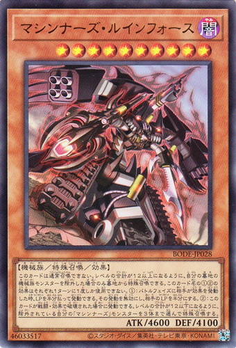 ![]() ![]() | BODE-JP028 マシンナーズ・ルインフォース モンスター BURST OF DESTINY ウルトラレア 属性:闇 分類:特殊召喚/効果 種族:機械族 レベル:10 攻撃力:4600 守備力:4100 このカードは通常召喚できない。レベルの合計が12以上になるように、自分の墓地の機械族モンスターを除外した場合のみ墓地から特殊召喚できる。 このカード名の①②の効果はそれぞれ1ターンに1度しか使用できない。 ①:バトルフェイズに相手が効果を発動した時、LPを半分払って発動できる。その発動を無効にし、相手のLPを半分にする。 ②:このカードが戦闘・効果で破壊された場合に発動できる。レベルの合計が12以下になるように、除外されている自分の「マシンナーズ」モンスターを3体まで選んで特殊召喚する。 |