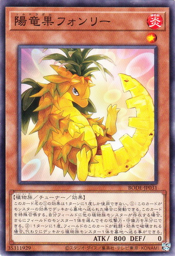 ![]() ![]() | BODE-JP031 陽竜果フォンリー モンスター BURST OF DESTINY ノーマル 属性:炎 分類:チューナー/効果 種族:植物族 レベル:1 攻撃力:800 守備力:0 このカード名の①の効果は1ターンに1度しか使用できない。 ①:このカードがモンスターの効果でデッキから墓地へ送られた場合に発動できる。このカードを特殊召喚する。自分フィールドに他の植物族モンスターが存在する場合、さらにフィールドのモンスター1体を選んでその攻撃力・守備力を半分にできる。 ②:1ターンに1度、フィールドのこのカードが戦闘・効果で破壊される場合、代わりにデッキから植物族モンスター1体を墓地へ送る事ができる。 |