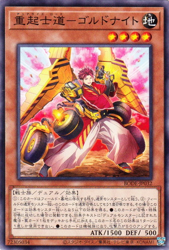 ![]() ![]() | BODE-JP032 重起士道―ゴルドナイト モンスター BURST OF DESTINY ノーマル 属性:地 分類:デュアル/効果 種族:戦士族 レベル:4 攻撃力:1500 守備力:500 ①:このカードはフィールド・墓地に存在する限り、通常モンスターとして扱う。 ②:フィールドの通常モンスター扱いのこのカードを通常召喚としてもう1度召喚できる。その場合このカードは効果モンスター扱いとなり以下の効果を得る。 ●このカードが召喚・特殊召喚に成功した場合に発動できる。効果テキストに「デュアルモンスター」と記された魔法・罠カード1枚をデッキから手札に加える。このカード名のこの効果は1ターンに1度しか使用できない。 ●このカードは機械族になり、攻撃力が500アップする。 |