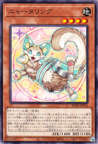 ![]() ![]() | BODE-JP034 ニャータリング モンスター BURST OF DESTINY ノーマル 属性:地 分類:効果 種族:サイバース族 レベル:4 攻撃力:1400 守備力:1100 このカード名の①の効果は1ターンに1度しか使用できない。 ①:フィールド魔法カードが発動した場合発動できる。このカードを手札から特殊召喚する。お互いのフィールドゾーンに表側表示でカードが存在する場合、さらにこのターン、このカードは戦闘・効果では破壊されない。 ②:このカードはモンスターゾーンに存在する限り、自分ターンの間、相手のフィールドゾーンの表側表示のカードの効果は無効化され、相手ターンの間、自分のフィールドゾーンの表側表示のカードの効果は無効化される。 |