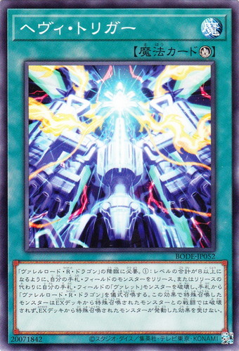 ![]() ![]() | BODE-JP052 ヘヴィ・トリガー 魔法 BURST OF DESTINY ノーマル 分類:儀式 「ヴァレルロード・R・ドラゴン」の降臨に必要。 ①:レベルの合計が8以上になるように、自分の手札・フィールドのモンスターをリリース、またはリリースの代わりに自分の手札・フィールドの「ヴァレット」モンスターを破壊し、手札から「ヴァレルロード・R・ドラゴン」を儀式召喚する。この効果で特殊召喚したモンスターはEXデッキから特殊召喚されたモンスターとの戦闘では破壊されず、EXデッキから特殊召喚されたモンスターが発動した効果を受けない。 |