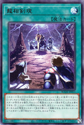 ![]() ![]() | BODE-JP053 龍相剣現 魔法 BURST OF DESTINY レア 分類:通常 このカード名の①②の効果はそれぞれ1ターンに1度しか使用できない。 ①:デッキから「相剣」モンスター1体を手札に加える。自分フィールドにSモンスターが存在する場合、代わりに幻竜族モンスター1体を手札に加える事もできる。 ②:このカードが除外された場合、自分フィールドの、「相剣」モンスターまたは幻竜族モンスター1体を対象として発動できる。そのモンスターのレベルをターン終了時まで1つ上げる、または下げる。 |