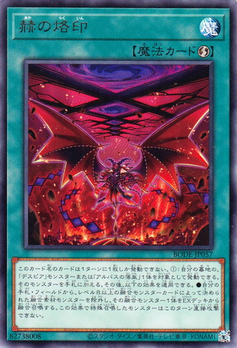 ![]() ![]() | BODE-JP057 赫の烙印 魔法 BURST OF DESTINY レア 分類:速攻 このカード名のカードは1ターンに1ターンに1枚しか発動できない。 ①:自分の墓地の、「デスピア」モンスターまたは「アルバスの落胤」1体を対象として発動できる。そのモンスターを手札に加える。その後、以下の効果を適用できる。 ●自分の手札・フィールドから、レベル8以上の融合モンスターカードによって決められた融合素材モンスターを除外し、その融合モンスター1体をEXデッキから融合召喚する。この効果で特殊召喚したモンスターはこのターン直接攻撃できない。 |
