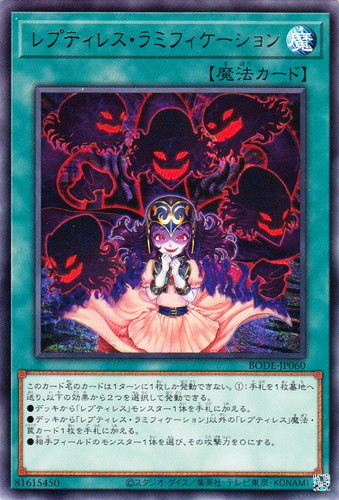 ![]() ![]() | BODE-JP060 レプティレス・ラミフィケーション 魔法 BURST OF DESTINY レア 分類:通常 このカード名のカードは1ターンに1枚しか発動できない。 ①:手札を1枚墓地へ送り、以下の効果から2つを選択して発動できる。 ●デッキから「レプティレス」モンスター1体を手札に加える。 ●デッキから「レプティレス・ラミフィケーション」以外の「レプティレス」魔法・罠カード1枚を手札に加える。 ●相手フィールドのモンスター1体を選び、その攻撃力を0にする。 |