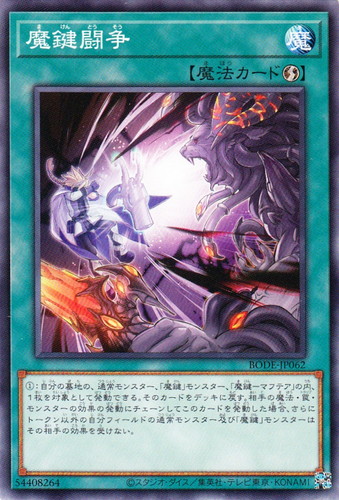 ![]() ![]() | BODE-JP062 魔鍵闘争 魔法 BURST OF DESTINY ノーマル 分類:速攻 ①:自分の墓地の、通常モンスター、「魔鍵」モンスター、「魔鍵―マフテア」の内、1枚を対象として発動できる。そのカードをデッキに戻す。相手の魔法・罠・モンスターの効果の発動にチェーンしてこのカードを発動した場合、さらにトークン以外の自分フィールドの通常モンスター及び「魔鍵」モンスターはその相手の効果を受けない。 |