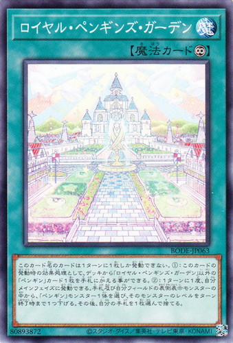 ![]() ![]() | BODE-JP063 ロイヤル・ペンギンズ・ガーデン 魔法 BURST OF DESTINY ノーマル 分類:永続 このカード名のカードは1ターンに1枚しか発動できない。 ①:このカードの発動時の効果処理としてデッキから「ロイヤル・ペンギンズ・ガーデン」以外の「ペンギン」カード1枚を手札に加える事ができる。 ②:1ターンに1度、自分メインフェイズに発動できる。手札及び自分フィールドの表側表示モンスターの中から、「ペンギン」モンスター1体を選び、そのモンスターのレベルをターン終了時まで1つ下げる。その後、自分の手札を1枚選んで捨てる。 |