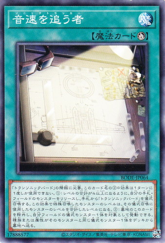 ![]() ![]() | BODE-JP064 音速を追う者 魔法 BURST OF DESTINY ノーマル 分類:儀式 「トランソニックバード」の降臨に必要。このカード名の②の効果は1ターンに1度しか使用できない。 ①:レベルの合計が4以上になるように、自分の手札・フィールドのモンスターをリリースし、手札から「トランソニックバード」を儀式召喚する。この効果で特殊召喚したモンスターのレベルは、その儀式召喚に使用したモンスターのレベルを合計したレベルになる。 ②:儀式のこのカードを除外し、自分フィールドの儀式モンスター1体を対象として発動できる。種族または属性がそのモンスターと同じ儀式モンスター1体をデッキから墓地へ送る。 |