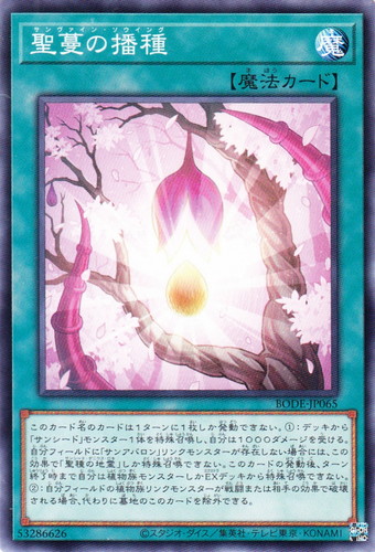 ![]() ![]() | BODE-JP065 聖蔓の播種 魔法 BURST OF DESTINY ノーマル 分類:通常 このカード名のカードは1ターンに1枚しか発動できない。 ①:デッキから「サンシード」モンスター1体を特殊召喚し、自分は1000ダメージを受ける。自分フィールドに「サンアバロン」リンクモンスターが存在しない場合には、この効果で「聖種の地霊」しか特殊召喚できない。このカードの発動後、ターン終了時まで自分は植物族モンスターしかEXデッキから特殊召喚できない。 ②:自分フィールドの植物族リンクモンスターが戦闘または相手の効果で破壊される場合、代わりに墓地のこのカードを除外する。 |