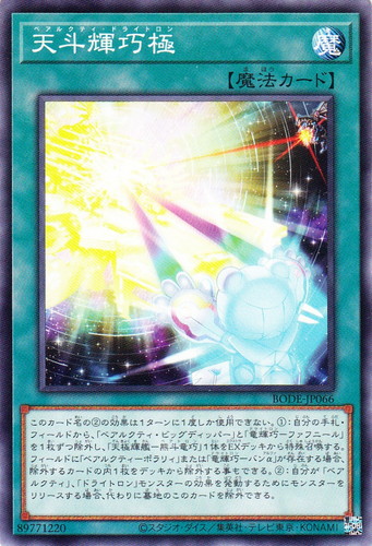 ![]() ![]() | BODE-JP066 天斗輝巧極 魔法 BURST OF DESTINY ノーマル 分類:通常 このカード名の②の効果は1ターンに1度しか使用できない。 ①:自分の手札・フィールドから、「ベアクルティ・ビッグディッパー」と「竜輝巧―ファフニール」を1枚ずつ除外し、「天極輝艦―熊斗竜巧」1体をEXデッキから特殊召喚する。フィールドに「ベアクルティ―ポラリィ」または「竜輝巧―バンα」が存在する場合、除外するカードの内1枚をデッキから除外する事もできる。 ②:自分が「ベアクルティ」、「ドライトロン」モンスターの効果を発動するためにモンスターをリリースする場合、代わりに墓地のこのカードを除外できる。 |