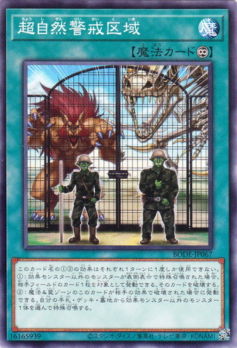 ![]() ![]() | BODE-JP067 超自然警戒区域 魔法 BURST OF DESTINY ノーマル 分類:永続 このカード名の①②の効果はそれぞれ1ターンに1度しか使用できない。 ①:効果モンスター以外のモンスターが表側表示で特殊召喚された場合、相手フィールドのカード1枚を対象として発動できる。そのカードを破壊する。 ②:魔法&罠ゾーンのこのカードが相手の効果で破壊された場合に発動できる。自分の手札・デッキ・墓地から効果モンスター以外のモンスター1体を選んで特殊召喚する。 |