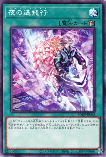 ![]() ![]() | BODE-JP068 夜の逃飛行 魔法 BURST OF DESTINY ノーマル 分類:速攻 ①:自分フィールドの表側表示モンスター1体を対象として発動できる。その表側表示モンスターを持ち主の手札に戻す。このターン、お互いにこの効果で手札に加えたカード及びその同名カードの効果を発動できない。 |