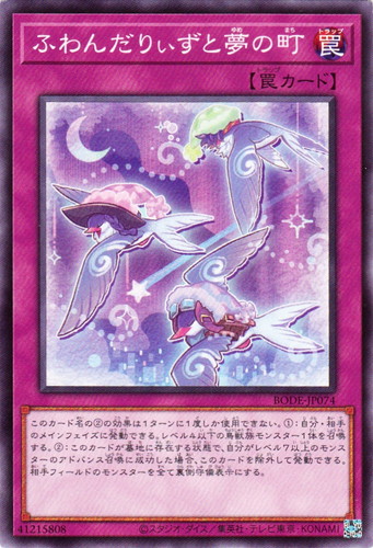 ![]() ![]() | BODE-JP074 ふわんだりぃずと夢の町 罠 BURST OF DESTINY ノーマル 分類:通常 このカード名の②の効果は1ターンに1度しか使用できない。 ①:自分・相手のメインフェイズに発動できる。レベル4以下の鳥獣族モンスター1体を召喚する。 ②:このカードが墓地に存在する状態で、自分がレベル7以上のモンスターのアドバンス召喚に成功した場合、このカードを除外して発動できる。相手フィールドのモンスターを全て裏側守備表示にする。 |