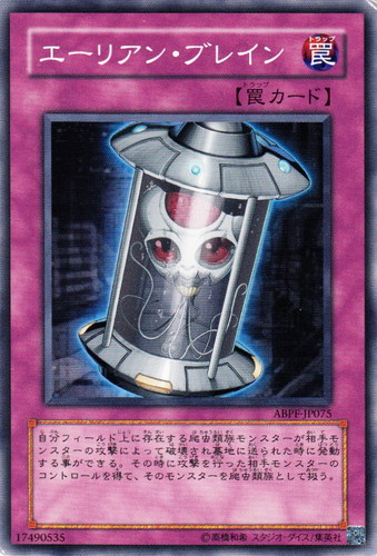 ![]() ![]() | ABPF-JP075 エーリアン・ブレイン 罠 ABSOLUTE POWERFORCE ノーマル 分類:通常 自分フィールド上に存在する爬虫類族モンスターが相手モンスターの攻撃によって破壊され墓地に送られた時に発動する事ができる。その時に攻撃を行った相手モンスターのコントロールを得て、そのモンスターを爬虫類族として扱う。 |