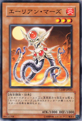 ![]() ![]() | CDIP-JP034 エーリアン・マーズ モンスター CYBERDARK IMPACT ノーマル 属性:炎 分類:効果 種族:爬虫類族 レベル:3 攻撃力:1000 守備力:1000 このカードがフィールド上に表側表示で存在する限り、「エーリアン・マーズ」以外のAカウンターが乗ったモンスターの効果を無効化する。 |