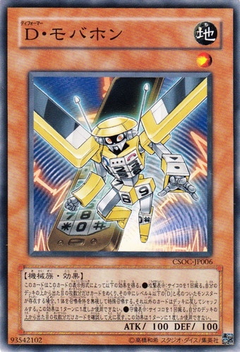 ![]() ![]() | CSOC-JP006 D・モバホン モンスター CROSSROADS OF CHAOS ノーマル 属性:地 分類:効果 種族:機械族 レベル:1 攻撃力:100 守備力:100 このカードはこのカードの表示形式によって以下の効果を得る。 ●攻撃表示:サイコロを1回振る。自分のデッキの上から出た目の枚数分だけカードをめくり、その中にレベル4以下の「D」と名のついたモンスターが存在する場合、1体を召喚条件を無視して特殊召喚する。それ以外のカードはデッキに戻してシャッフルする。この効果は1ターンに1度しか使用できない。 ●守備表示:[text:サイコロ]]を1回振る。自分のデッキの上から出た目の枚数分だけカードを確認して元に戻す。この効果は1ターンに1度しか使用できない。 |