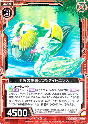 ![]() ![]() | B21-007 予感の愛鳥クンツァイトエクス ゼクス ブースターパック 運命廻放編 叛逆の狼煙 N 色:赤 種族:ギガンティック コスト:3 パワー:4500 【常】スタートカード 【自】【有効】チャージ【誘発】あなたのターンのターン終了時。【効果】あなたのリソースに[ギガンティック]が2枚以上ある場合、このターンの間にあなたの手札にあるカードがあなたの[ギガンティック]の能力でトラッシュに置かれていたならば、カードを1枚引き、ノーマルスクエアにある相手のゼクスを1枚選び、5000ダメージを与える。 とりあえず妹は健在、黒崎博士も正気を保ってる。並行過去世界には、まだ希望が残ってるのね。 ~倉敷世羅~ illust:K2商会 |