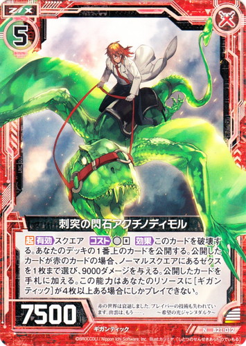 ![]() ![]() | B21-012 刺突の閃石アクチノディモル ゼクス ブースターパック 運命廻放編 叛逆の狼煙 N 色:赤 種族:ギガンティック コスト:5 パワー:7500 【起】【有効】スクエア【コスト】[無0]【効果】このカードを破壊する。あなたのデッキの1番上のカードを公開する。公開したカードが赤のカードの場合、ノーマルスクエアにあるゼクスを1枚まで選び、9000ダメージを与える。公開したカードを手札に加える。この能力はあなたのリソースに[ギガンティック]が4枚以上ある場合にしかプレイできない。 赤の世界は衰退しました。ブレイバーの技術も失われています。出雲は、もう・・・・・・。 ~希望の光ジャンヌダルク~ illust:カジミヤ |