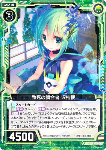 ![]() ![]() | B21-086 致死の調合者 沢桔梗 ゼクス ブースターパック 運命廻放編 叛逆の狼煙 N 色:緑 種族:ホウライ コスト:3 パワー:4500 【常】スタートカード 【自】【有効】チャージ【誘発】相手のターンのメインフェイズ開始時。【効果】あなたのリソースに[ホウライ]が3枚以上ある場合、スクエアにあるあなたの[ホウライ]を1枚選び、スリープしてよい。スリープしたならば、ノーマルスクエアにある相手のゼクスを1枚選び、リソースにスリープで置き、あなたのデッキの1番上のカードをリソースにスリープで置く。 和修吉の寝首をかく。力を貸せ。 ~神薙の龍王 難陀~ illust:天川さっこ |