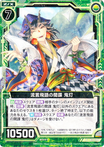 ![]() ![]() | B21-099 流言飛語の間諜 鬼灯 ゼクス ブースターパック 運命廻放編 叛逆の狼煙 N 色:緑 種族:ホウライ コスト:7 パワー:10500 【自】【有効】スクエア【誘発】相手のターンのメインフェイズ開始時。【効果】「流言飛語の間諜 鬼灯」以外のスクエアにあるあなたのゼクスを1枚選び、ターン終了時まで、以下の能力を与える。“【常】【有効】スクエア【効果】あなたの「流言飛語の間諜 鬼灯」はダメージを受けない。” 号外、号外だよ!五頭領を汚い罠で葬り去ろうとした極悪獣人を一面記事でお届けだ! ~流言飛語の間諜 鬼灯~ illust:JURI |