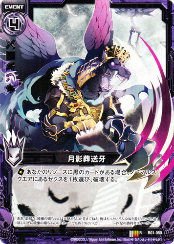 ![]() ![]() | B01-080 月影葬送牙 イベント ブースターパック 第1弾 異世界との邂逅 R 色:黒 アイコン:イグニッション コスト:4 ◆あなたのリソースに黒のカードがある場合、ノーマルスクエアにあるゼクスを1枚選び、破壊する。 ああ、退屈だ。綾瀬の嬢ちゃんは天使どもしか見えてねえ。俺はもっといろんな奴と遊びたいぜ。退屈しのぎに綾瀬の嬢ちゃんのスカートでもめくりにいくか。 ~四足の勝利者ズィーガー illust:吟 |