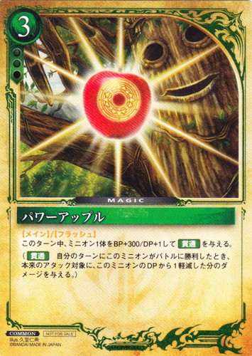 ![]() ![]() | パワーアップル マジック DECKCODE:0(カードゲーマーvol.44特別付録) COMMON 色:緑 コスト:3(緑緑無) 【メイン】/【フラッシュ】このターン中、ミニオン1体をBP+300/+1して【貫通】を与える。(【貫通】自分のターンにこのミニオンがバトルに勝利したとき、本来のアタックの対象に、このミニオンのDPから1軽減した分のダメージを与える。) illust:久堂仁希 |